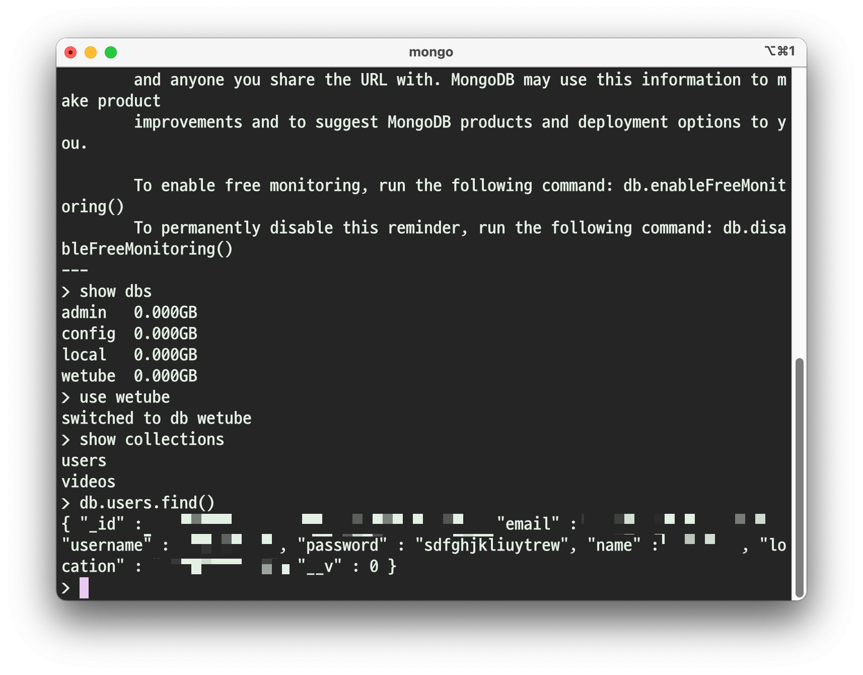 터미널을 이용해 저장된 user collection을 확인하면 위처럼 정보를 확인할 수 있다. 하지만 사진처럼 사용자의 비밀번호가 드러나면 안되니 hashing을 이용할 필요가 있다.
